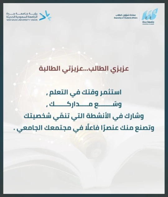 The Deanship of Student Affairs was established by a decision of His Excellency the President of University of Jeddah in 1436 AH. It is one of the supporting deanships affiliated with the Vice Presidency for Academic Affairs and Development. The Deanship contributes to achieving the mission and goals of the university by providing an attractive environment that contributes to deepening students’ connection to their faith, their national affiliation, strengthening values, achieving psychological and social balance, and developing students’ skills and abilities that distinguish them with efficiency and effectiveness in the labor market.